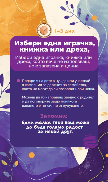 Детето влиза в ролята на благодетел – избира, опакова и дарява нещо свое, превръщайки съчувствието в реално действие.