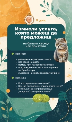 Изпълнява задачата в реалния свят (напр. да организира рожден ден, да дари стара вещ или да създаде нова услуга) в посочения срок.